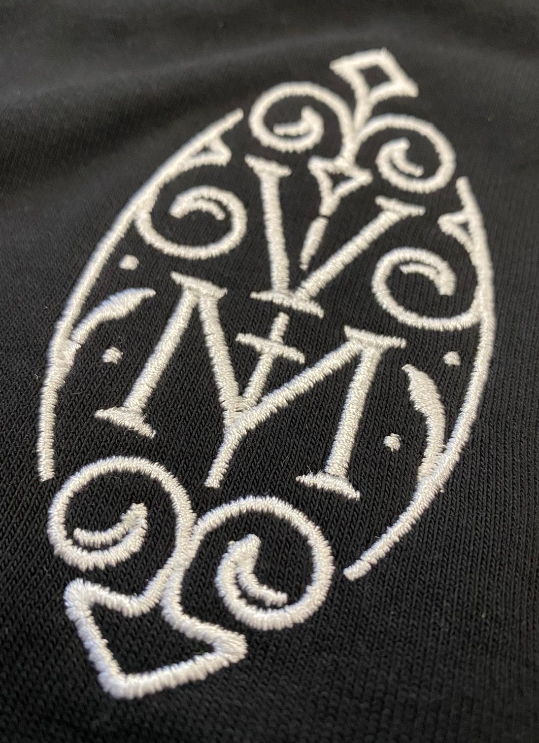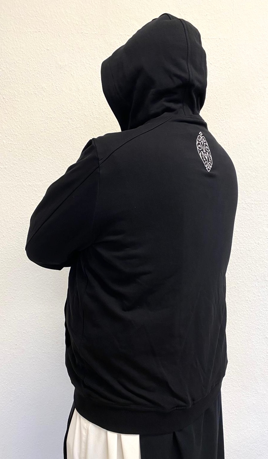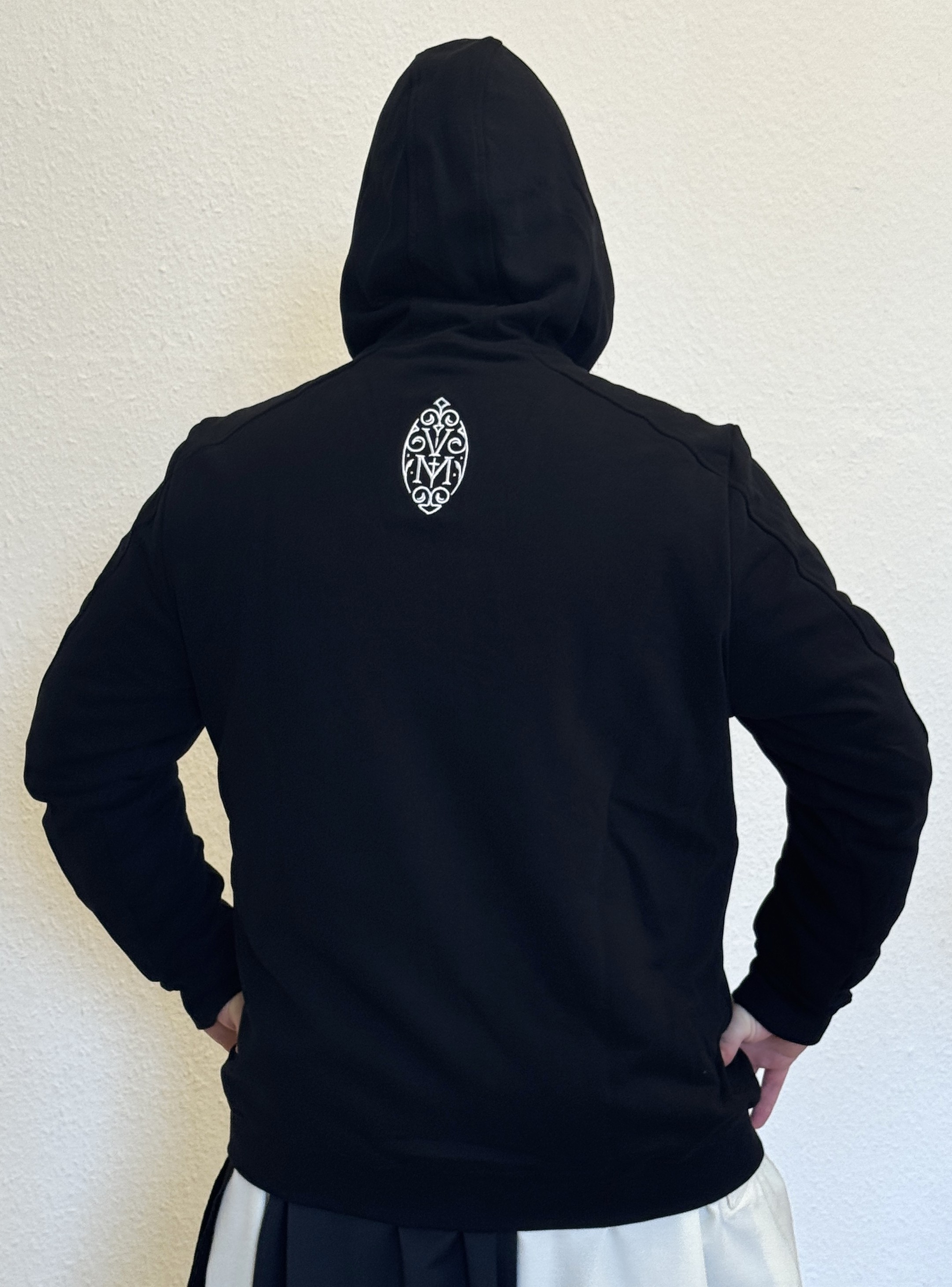 Schwarzer Kapuzenpullover mit Bauchtaschen und Reisverschluss. Auf Brusthöhe bestickt mit einem zweifarbigen Herz-Jesu-Logo. Hinten bestickt mit dem Logo "Via Monastica 1098". Angenehem zu tragen und vielseitig verwendbar für den Alltag, Freizeit und kühle Abende.