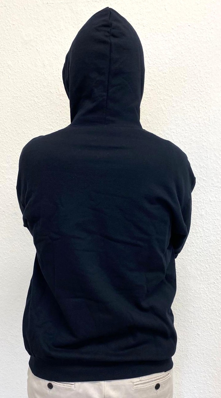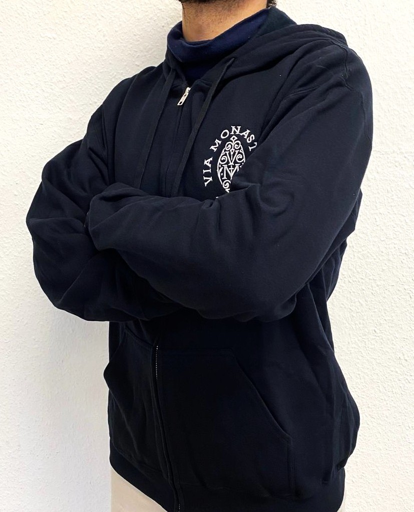 Schwarzer Kapuzenpullover mit Reisverschluss und zwei Bauchtaschen. Auf Brusthöhe bestickt mit dem Logo der "Via Monastica 1098". Angenehem zu tragen und vielseitig verwendbar für den Alltag, Freizeit und kühle Abende.