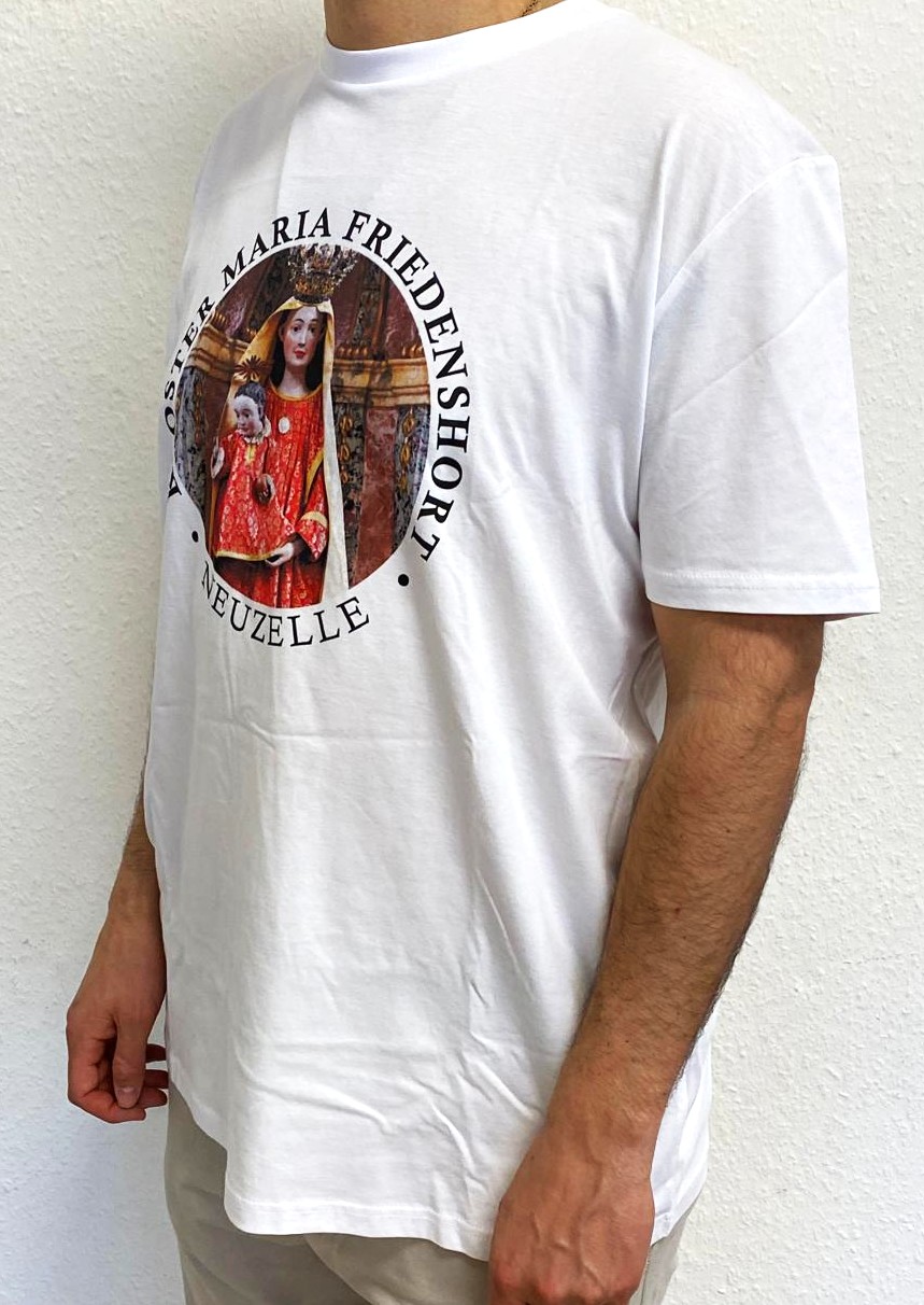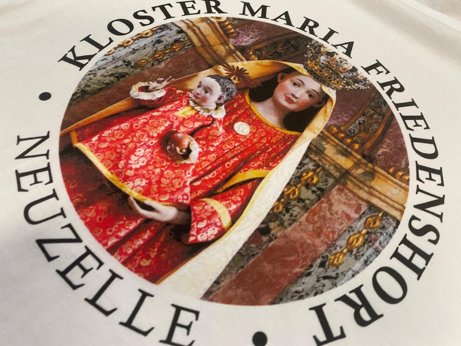 Weißes T-Shirt aus Baumwolle bedruckt mit der Neuzeller Wallfahrtsmadonna.