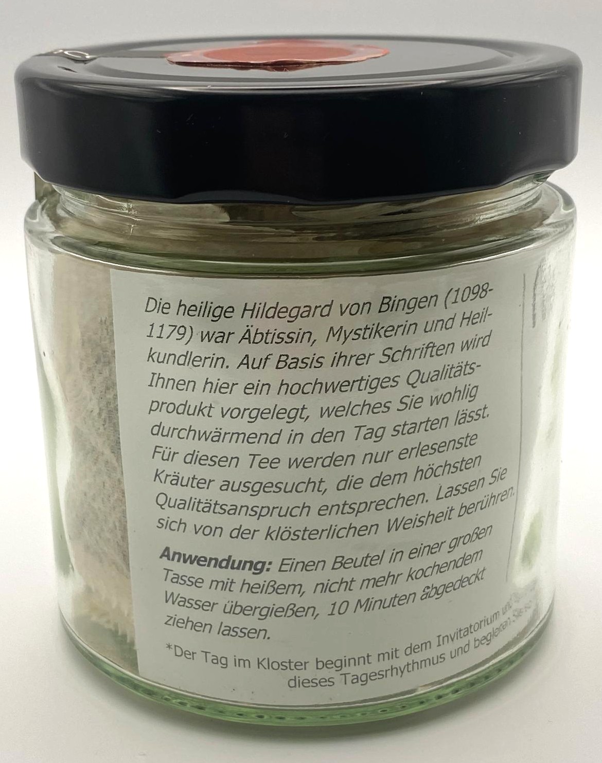 Dieser Tee entstand aus der Zusammenarbeit eines Mönchs und eines Apothekers. Er knüpft an die Tradition der Hildegard von Bingen an, einer der bedeutendsten Frauen des Mittelalters. Von ihr sind über 300 Briefe erhalten, darunter Korrespondenzen mit Persönlichkeiten wie Papst Eugen III. und Kaiser Friedrich Barbarossa. Ihre naturheilkundlichen Schriften genießen bis heute hohes Ansehen und bilden einen wertvollen Hintergrund für die Entwicklung dieser Teemischung.