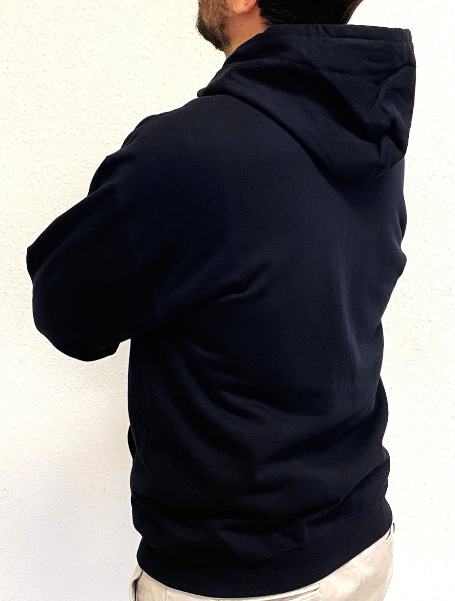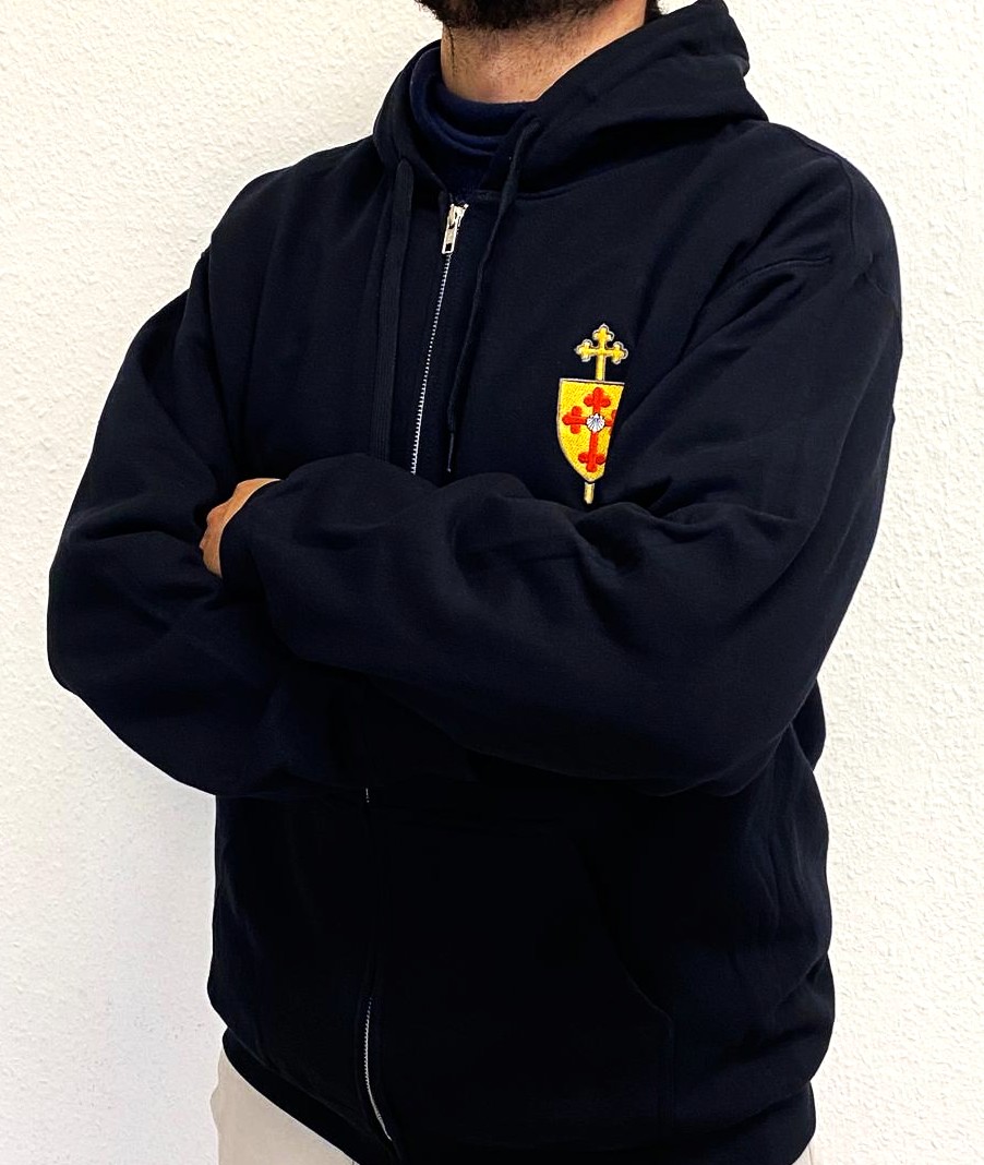 Schwarzer Kapuzenpullover mit Reisverschluss und zwei Bauchtaschen. Auf Brusthöhe bestickt mit dem Logo (Wappen) der Neuzeller Mönche. Angenehem zu tragen und vielseitig verwendbar für den Alltag, Freizeit und kühle Abende.