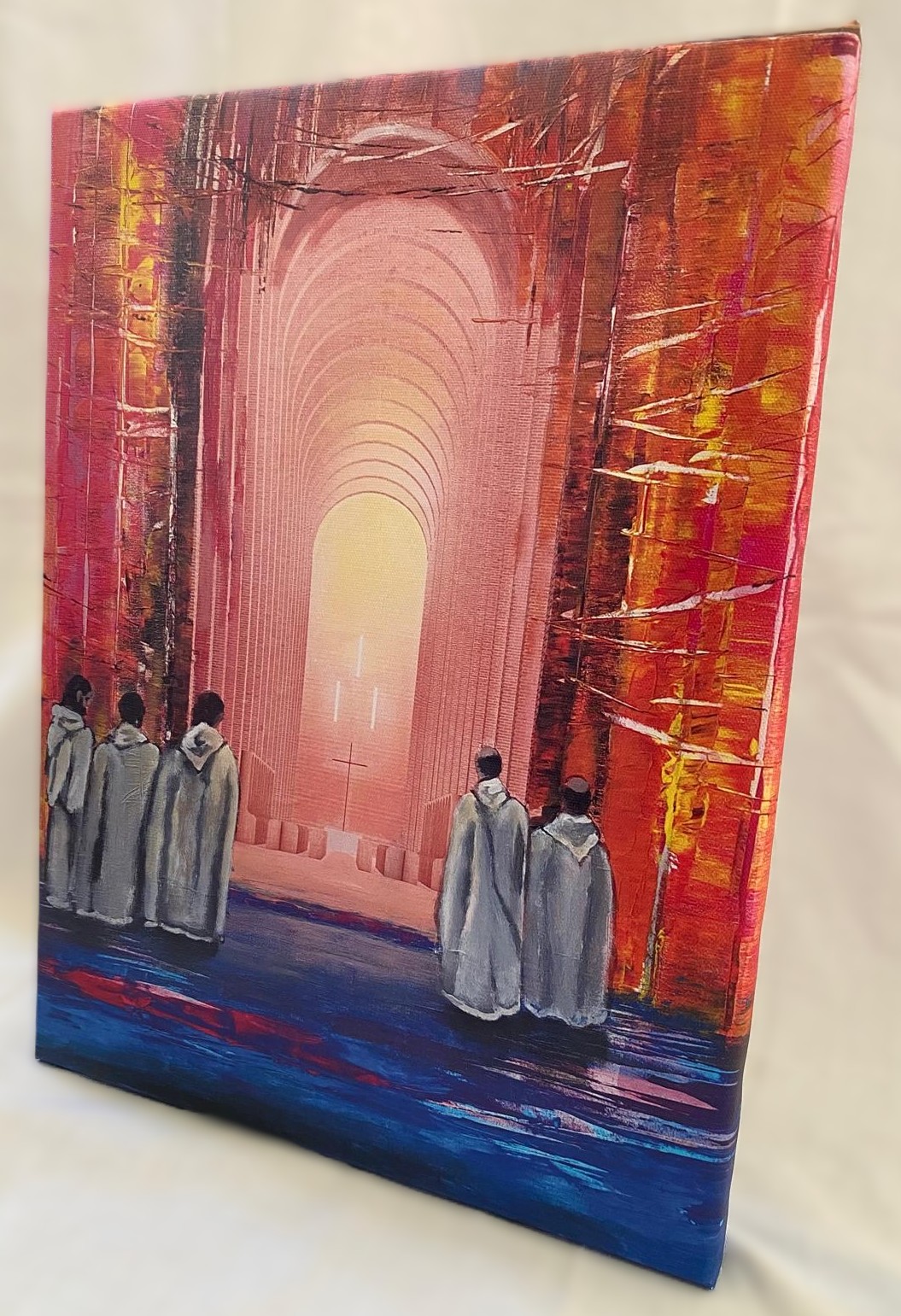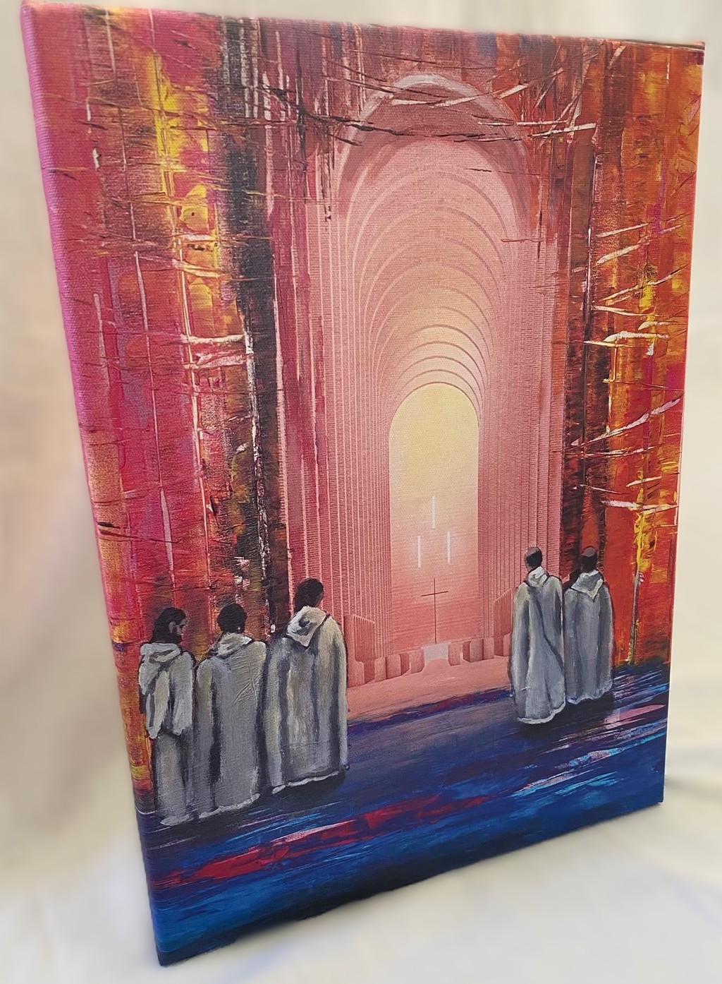 Angeregt durch die architektonischen Entwürfe des Neubauprojekts visualisierte der Künstler Martin Ludwig das zwar noch im Bau befindliche, aber geistlich bereits begonnene Kloster „Maria Mutter Friedenshort“. Sein zentrales Anliegen ist es, die innere Dynamik sakraler Kunst sichtbar zu machen: Das Innere, Geistige und Spirituelle des Mönches findet in der Architektur seinen Ausdruck, wird harmonisiert und strebt einer Vollendung zu, ohne bereits abgeschlossen zu sein. So erscheint das klösterliche Leben als ganzheitliche Form intensiver Gottesbegegnung, die auf Erden notwendig bruchstückhaft bleibt und doch in ihrer Sehnsucht auf etwas Ewiges, Wahres, Gutes und Schönes ausgerichtet ist.