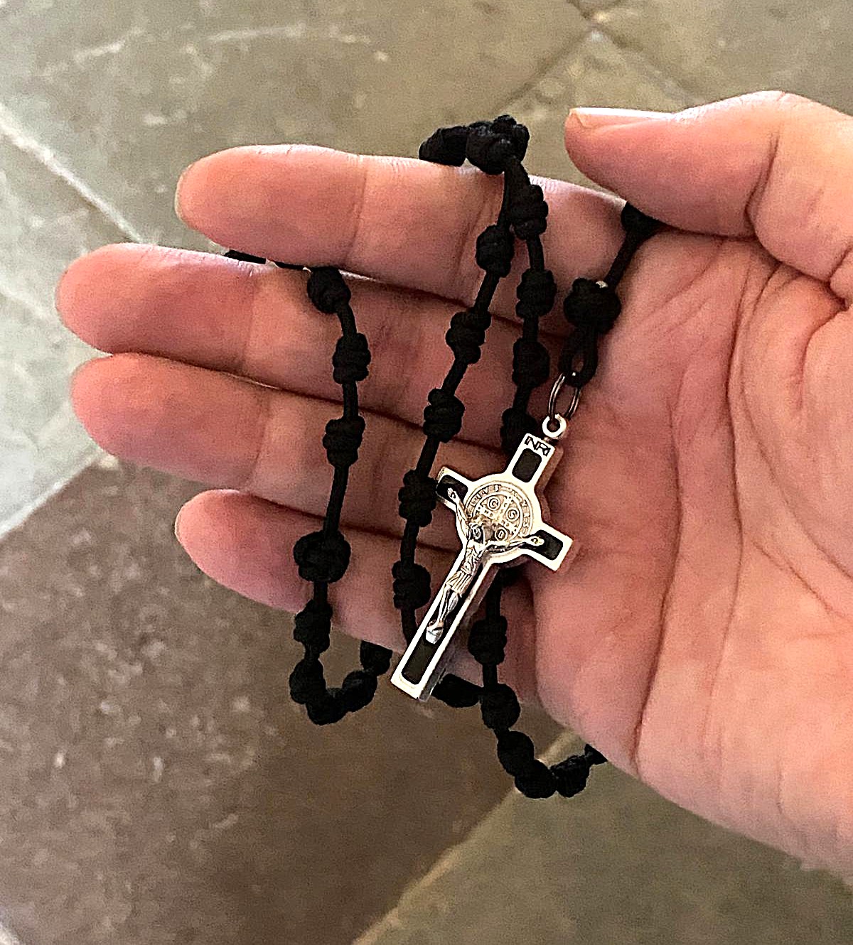 Rosenkranz mit schwarzen, geknoteten Perlen und Benediktus-Kreuz