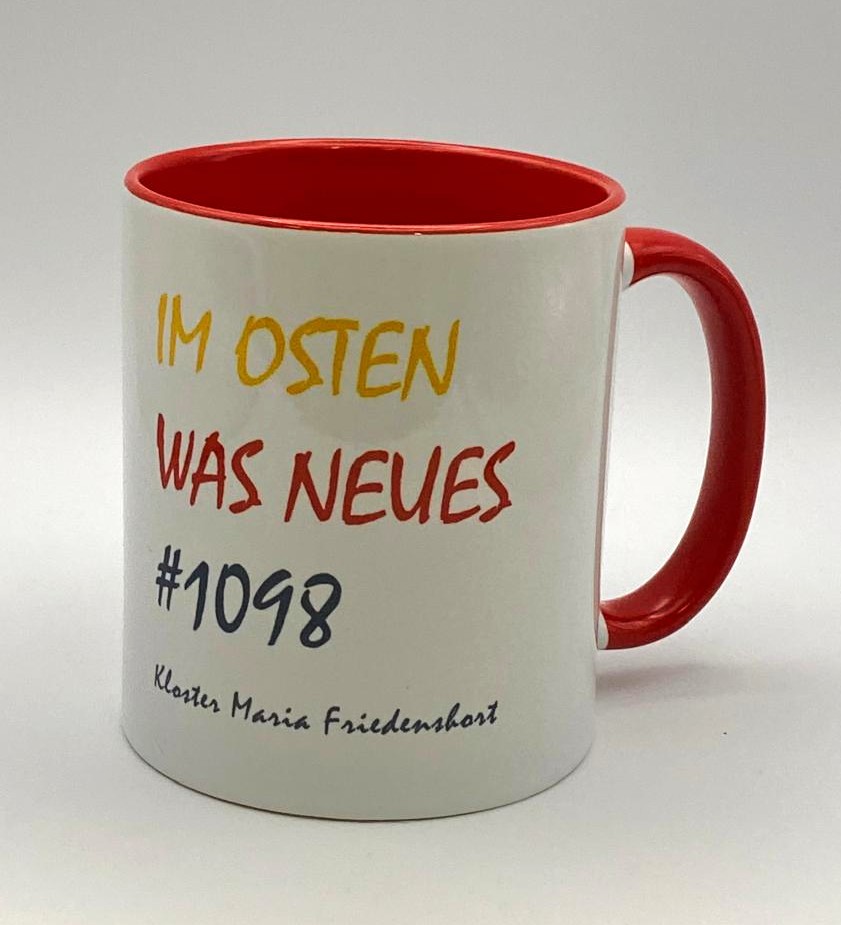Beiderseitg bedruckte Keramiktasse: einerseits mit dem Logo (Wappen) der Neuzeller Mönche, andererseits mit dem Podcast-Titel "Im Osten was Neues".