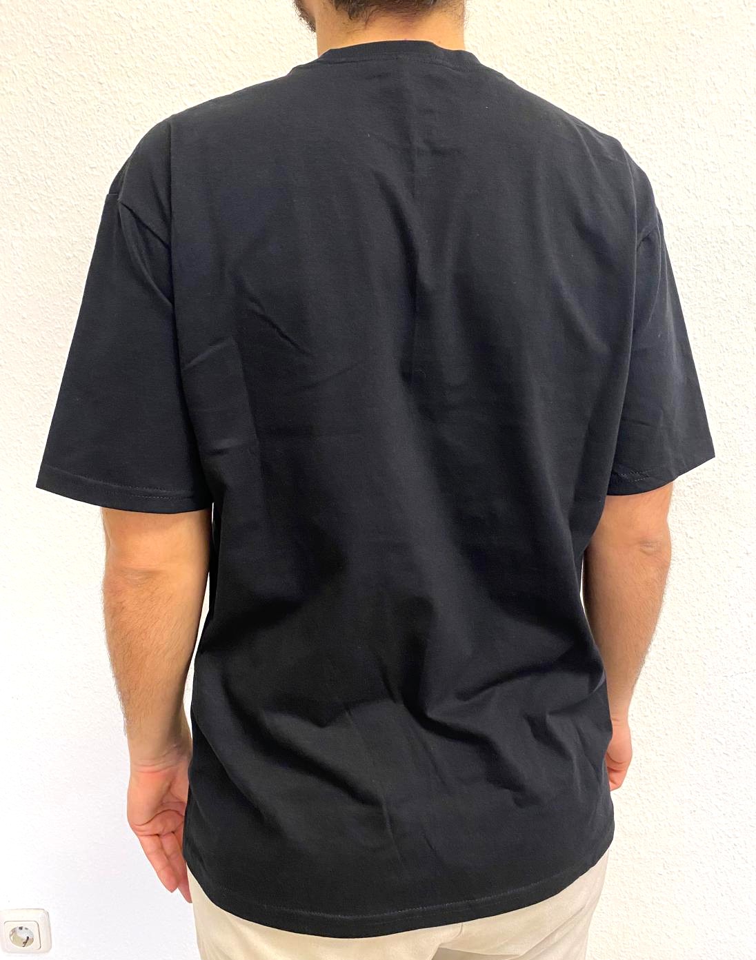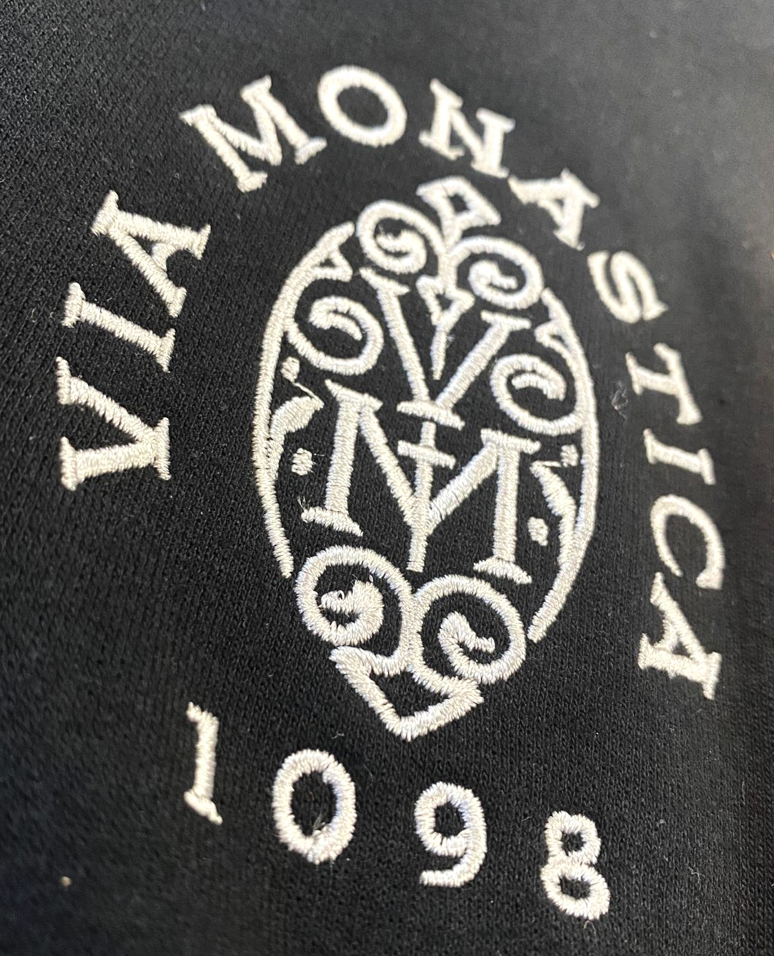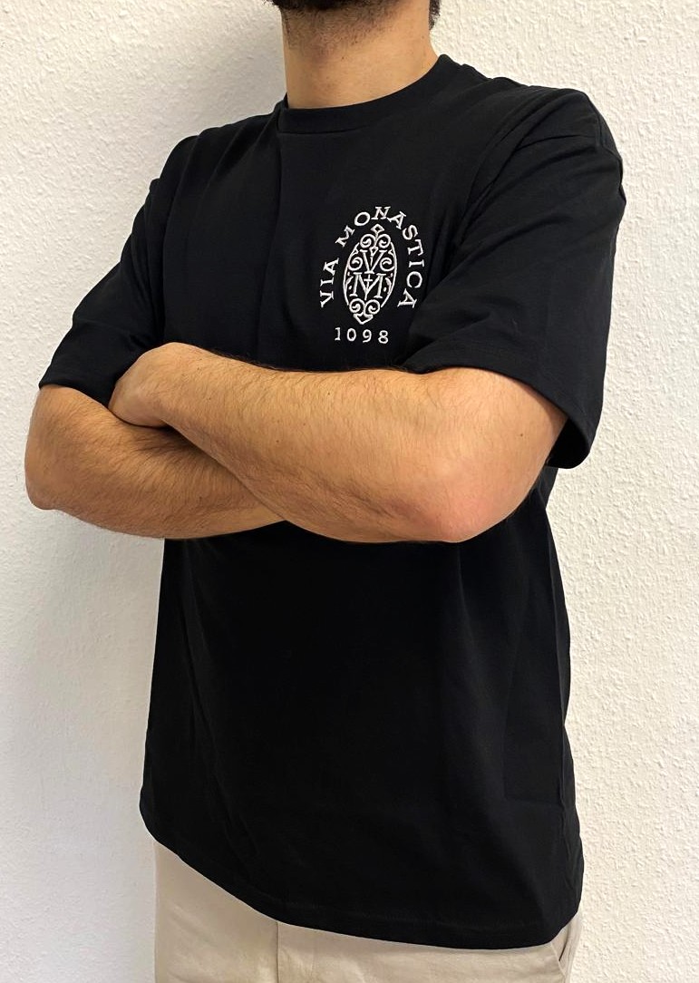 Schwarzes T-Shirt bestickt mit dem Logo "Via Monastica 1098".